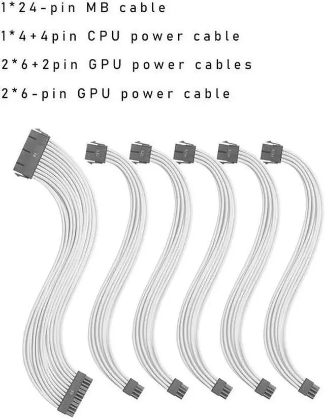 Mod Sleeved Cable, White Power Supply Cable Extension Kit, 24PIN ATX, 4+4 PIN EPS, Dual 6+2 PIN PCIE, Dual 6 PIN PCIE(11.81")Mod Sleeved Cable, White Power Supply Cable Extension Kit, 24PIN ATX, 4+4 P