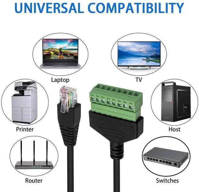 This RJ45 Male to 8 Pin Screw Terminal adaptor is wired in accordance with the EIA/TIA T568B wiring standard for structured cabling. It can connect external network cables and transmit network signals, is better shielding against electromagnetic interference.
