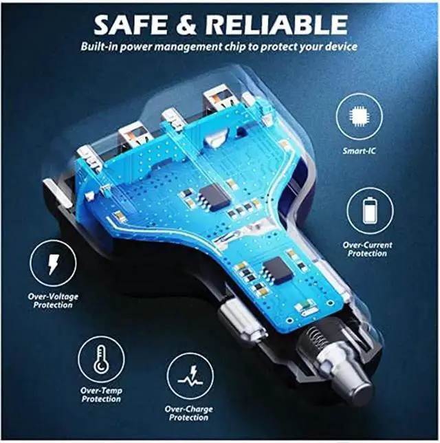 [Safe Design] Advanced V0 grade PC fireproof material with metal edges, chips and indicator lights make up this car charger adapter. The smart IC effectively recognizes your device, and the LED indicator reminds you of the working status, which can safely and quickly charge multiple devices at the same time.