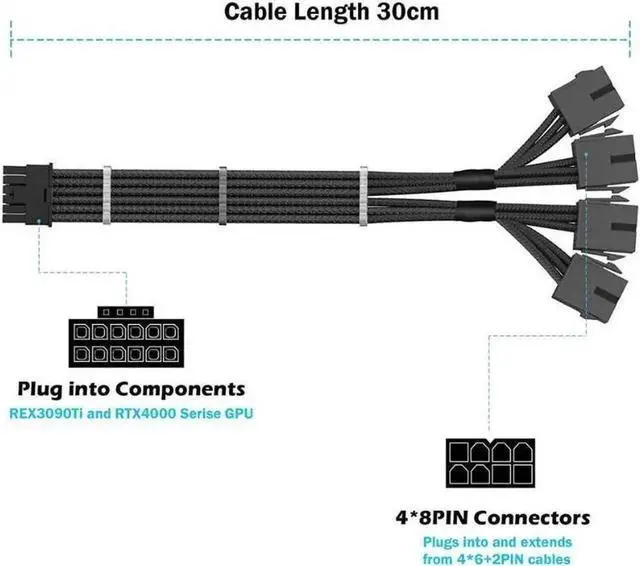 2: This 16pin (12+4) to 4x8pin only supports RTX4090/4080/3090ti and 4000 series GPUs