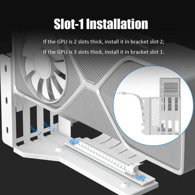 GPU Vertical Mount Bracket with 150mm PCIE 4.0 Riser Cable for 3-slot GPU. Due to the length limitation, the female PCIE port can be secured in slot 1 of the bracket.
