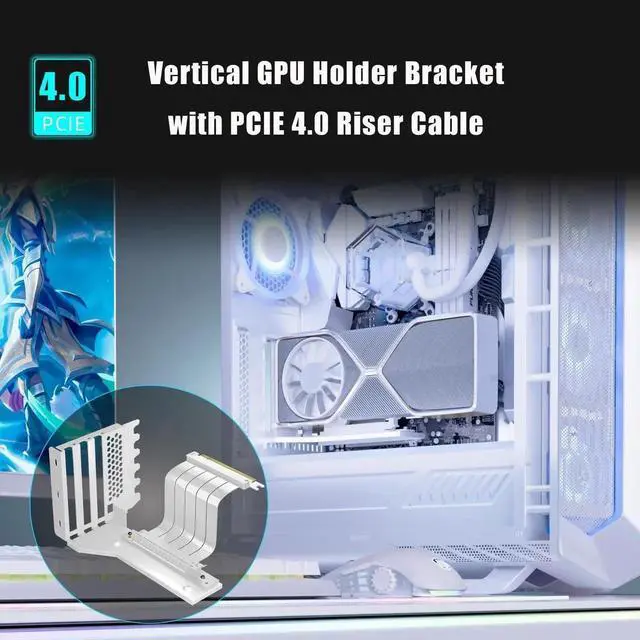 Vertical GPU Holder Bracket with PCIE 4.0 Riser Cable, fits GPUs like GeForce RTX 40/30 Series and Radeon RX 7000/6000 Series, etc. Overall white style for white PC cases.