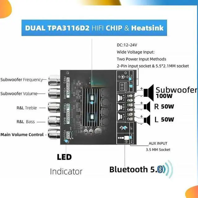 • ZK-TB21 Bluetooth 5.0 Subwoofer Amplifier Board 50WX2+100W 2.1 Channel Power Audio Stereo Amplifier Board Bass AMP