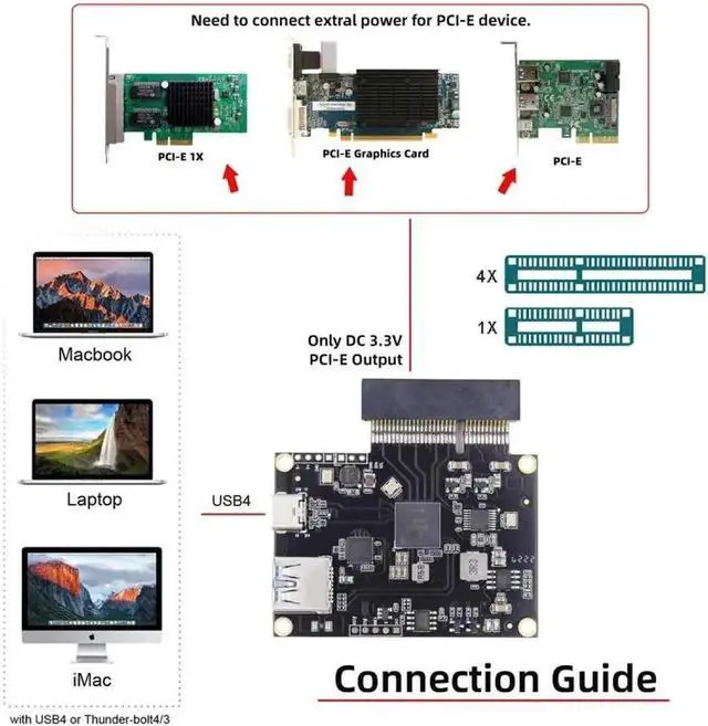 • The PCBA adapter only works for DC3.3V Output PCI-E device.(You need to connect extra power for DC5V/12V device like Graphics card,Lan Card)