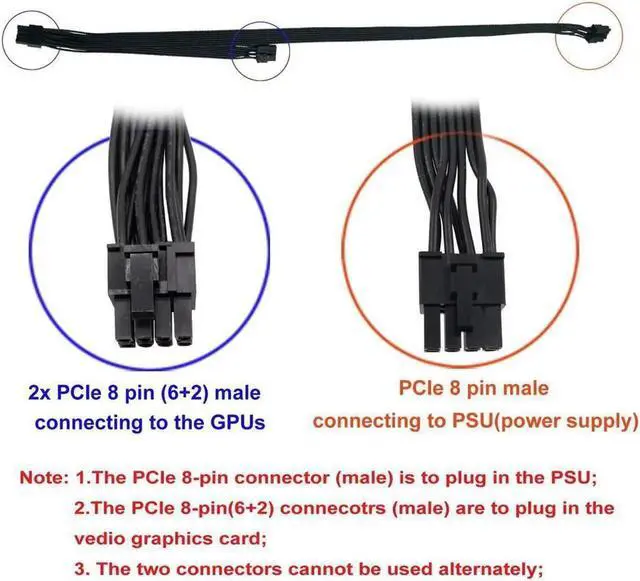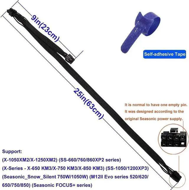 This PCIe power adapter cable is specially designed for Seasonic modular power supplies. It converts one 8-pin PCIe output into two 6+2-pin PCIe connectors to support multi-GPU setups and high-performance video cards. The 25-inch+9-inch extended length allows neat wiring, while high-quality construction ensures safe and stable power under heavy load.