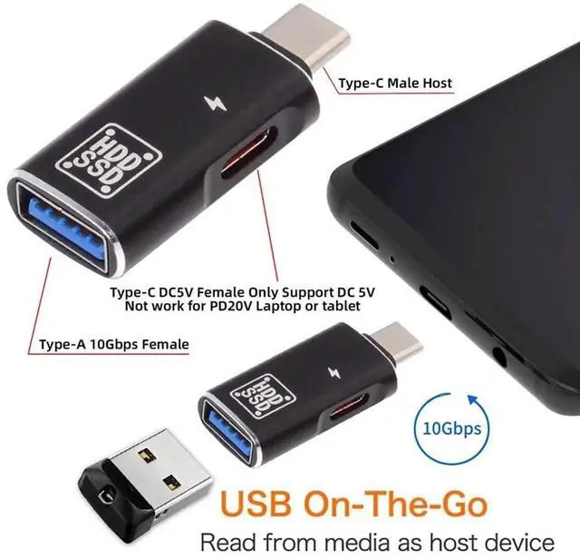 This multifunctional USB-C OTG adapter supports up to 10Gbps ultra-fast data transmission, delivering efficient and stable file transfer performance. Built with a USB 3.0 female port and independent DC 5V power input, it enables OTG connection while supplying supplementary power, effectively solving power shortage issues for high-power peripherals. Compact and durable in structure, it features plug-and-play operation without extra drivers. Widely applicable for smartphones, tablets and more Type-C devices to connect external storage, input devices and other USB accessories.