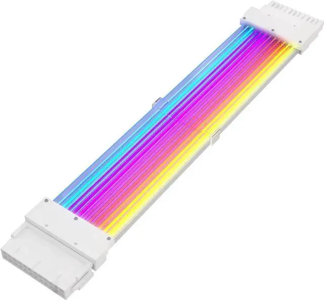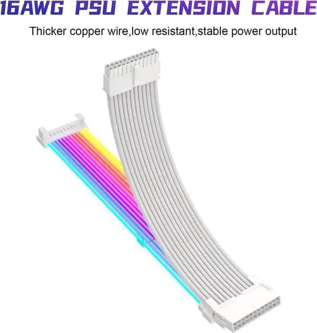 This ARGB PSU extension cable kit features integrated 5V 3Pin addressable RGB lighting, supporting motherboard synchronous lighting control for customizable glowing effects. Adopting high-grade sleeved outer layer and pure copper wire core, it ensures stable and safe power output while delivering stunning visual decoration. Coming with white housing and A-style white connectors, it creates a minimalist pure white interior style for your PC chassis. Flexible cord design helps organize messy wires, improve chassis airflow and upgrade overall building aesthetics. Perfect for DIY gamers, PC mod enthusiasts and desktop aesthetic renovation.