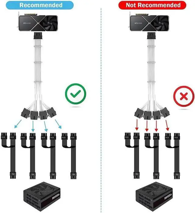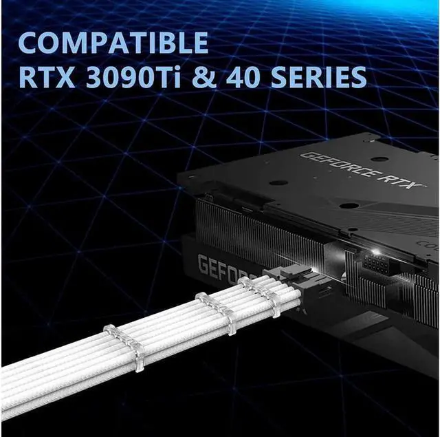 This PCIe 5.0 12VHPWR sleeved extension cable adopts 16Pin(12+4) to 4×8Pin design, specially built for RTX 3090Ti and RTX 40 series high-power graphics cards. Made of 16AWG high-purity copper wire, it ensures efficient power transmission and reduces voltage drop under full load. Premium white braided sleeve resists wear and aging, while improving internal chassis aesthetics. Equipped with cable combs for neat cable management and better heat dissipation. 14-inch flexible length fits most mid-tower and full-tower cases, plug and play for safe and simple DIY installation.