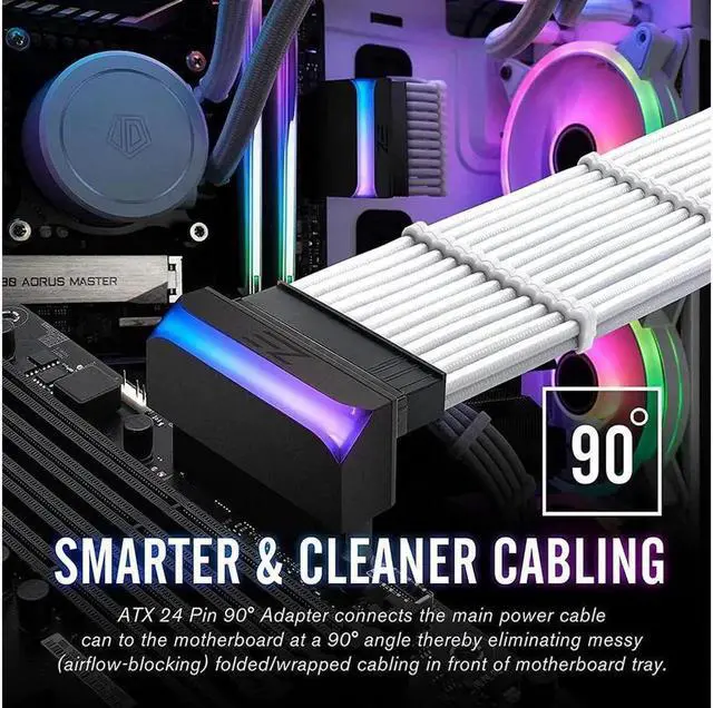 This 90-degree ATX 24Pin power adapter is designed for compact chassis and tidy cable management. The right-angle design effectively avoids wire extrusion and hard bending, protecting power lines while optimizing internal layout. Built-in 5V ARGB connector enables seamless connection of light strips and ARGB devices for personalized gaming lighting. Made with durable insulated housing and precision pins, it provides stable and safe power transmission for long-term operation. Available in black and white, it is an ideal DIY accessory for PC assembly, modification and aesthetic gaming builds.