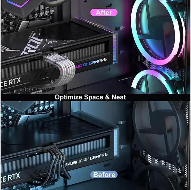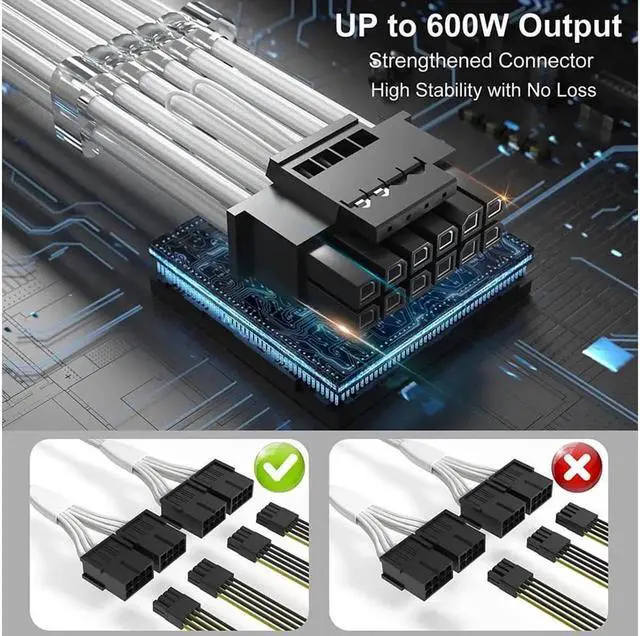 This PCIe 5.0 12VHPWR power extension cable adopts 16Pin 12+4 male to 4×8Pin female conversion design, perfectly compatible with RTX 3090Ti, 4070Ti, 4080, 4090 high-end graphics cards. Made of high-quality conductive core, it ensures continuous and stable high-load power transmission. The durable sleeved sleeve improves heat resistance and flexibility, effectively avoiding cable damage and tangling. Reasonable 14-inch length optimizes internal chassis wiring and promotes airflow. Plug and play for quick installation, this white power extender is a functional and aesthetic upgrade for custom gaming desktops.