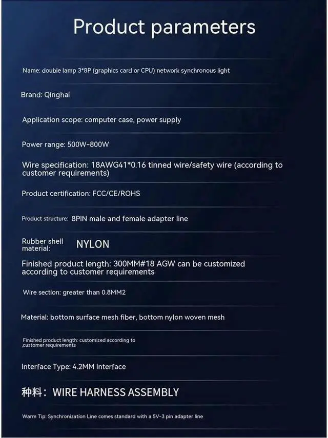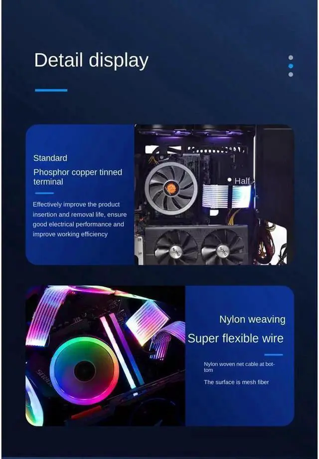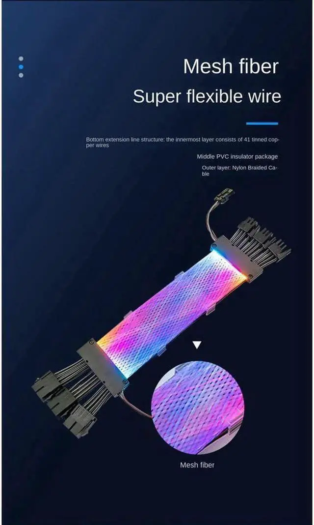 This ARGB 8Pin graphics card power extension cable combines stable power transmission with stunning customizable lighting. Adopting premium 18AWG 41*0.16 tinned wire, it delivers efficient, safe and continuous power output for high-load GPUs. The dual light source and 3×8Pin mesh synchronous ARGB design supports motherboard lighting synchronization, adding vibrant visual flair to your PC build. 8Pin male to female plug-and-play design extends original power connectors for cleaner chassis cable arrangement. Reinforced shielding and flexible mesh sleeve improve durability and heat dissipation, ideal for ATX gaming chassis, DIY modding and RGB themed desktop setups.