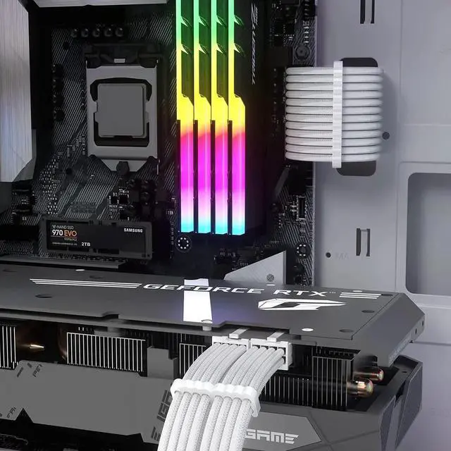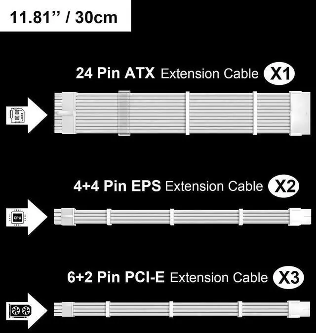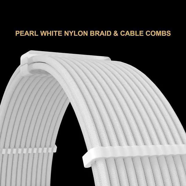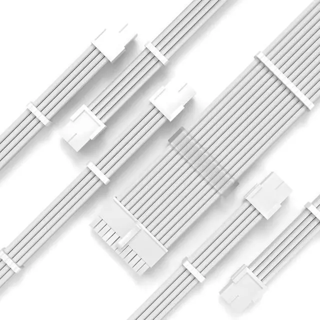 This white custom sleeved PSU extension cable kit is designed for aesthetic PC modding and neat cable management. Constructed with 18AWG high conductivity tinned wire, it ensures efficient and stable power transmission for motherboard, CPU and graphics card during long hours of gaming and heavy tasks. Fine woven outer sleeve enhances flexibility and durability for smooth chassis routing. Coming with supporting cable combs, it helps arrange cables neatly to improve internal ventilation and overall appearance. Simple plug-and-play installation without extra tools, perfectly suitable for white-themed gaming desktops, custom DIY builds and daily hardware upgrade.