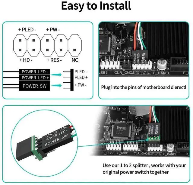 Comes with 1 to 2 Splitter: the small 1 to 2 splitter board makes the power button works with your original power supply works together