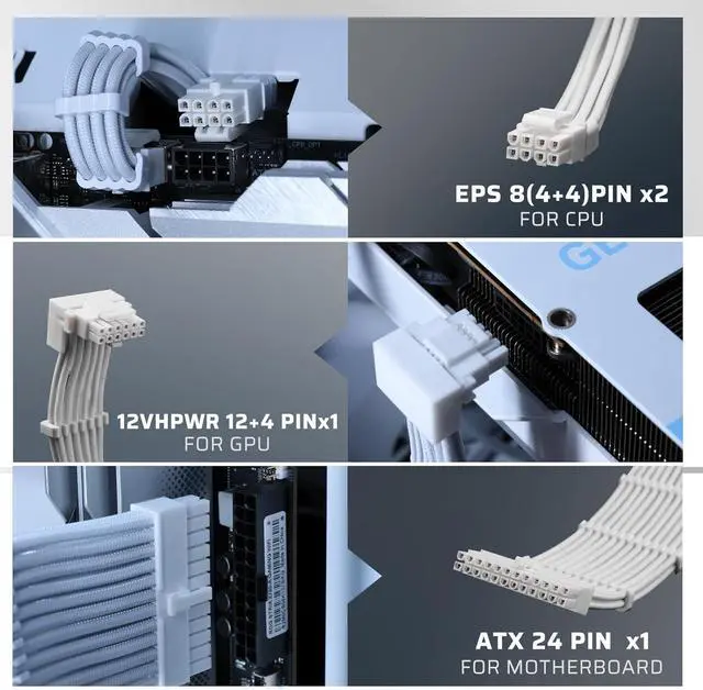 Designed for RTX 40 Series GPUs - The newest 12VHPWR PSU Cable Extension Kit Includes 2 x 4+4-pin EPS cables (for CPU), 1 x 24-pin ATX cable (for motherboard), and 1 x PCIe 5.0 12VHPWR 12+4-pin GPU cable, supporting the latest RTX40 series GPUs including RTX 3090Ti/4070/4080/4090 and other GPUs with 12VHPWR/12V2X6 connectors. Extend your original PSU cables effortlessly for cleaner, more organized cable management.