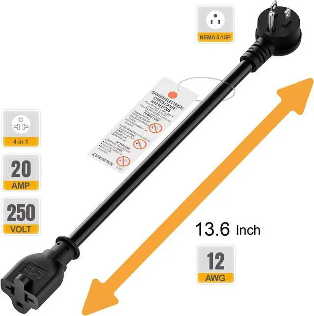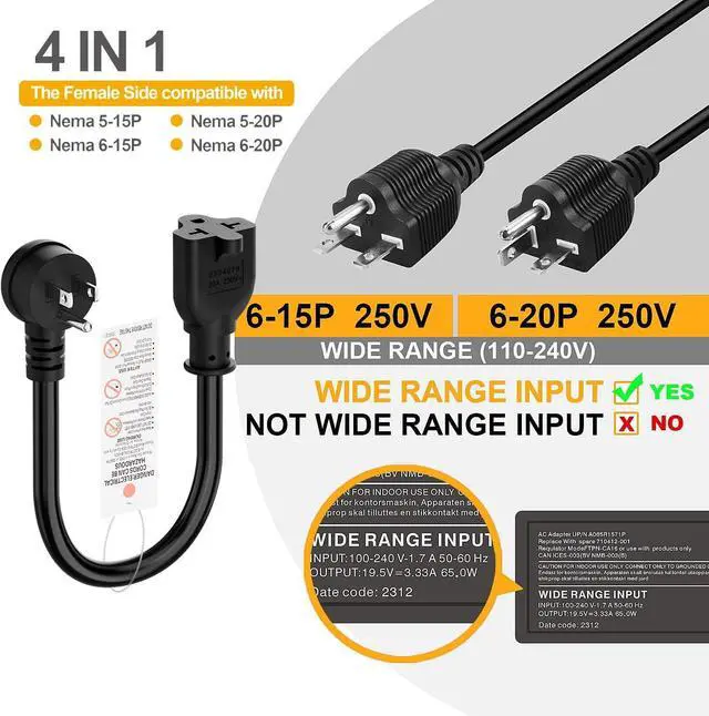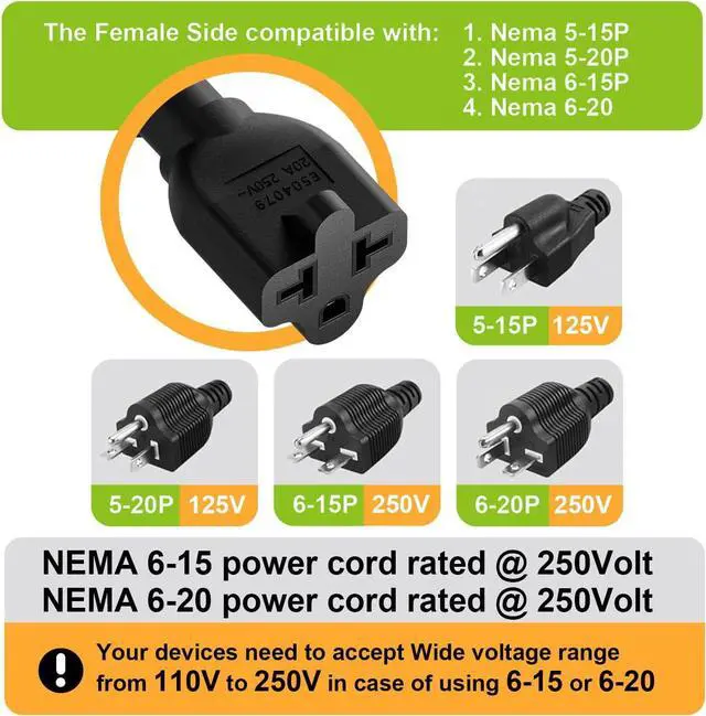 [HEAVY DUTY 12AWG COPPER WIRE] (4 in 1) AC Power adapter. Nema 5-15P 15-AMP male 125V to Nema 5-15R/5-20R/6-15R/6-20R ac adapter Your devices need to support WIDE RANGE VOLTAGE [range 110V to 220V] in case of connect to Nema 6-15P or Nema 6-20P 15A/20A 250V ac power devices.
