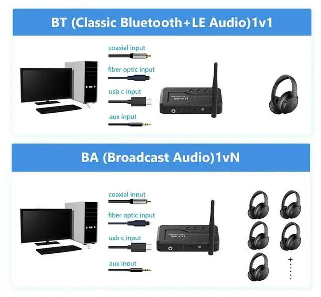 • LE Audio Bluetooth 5.3 Audio Transmitter Adapter For TV Headphons With Lossless Auracast LC3 For Gaming Watching Music