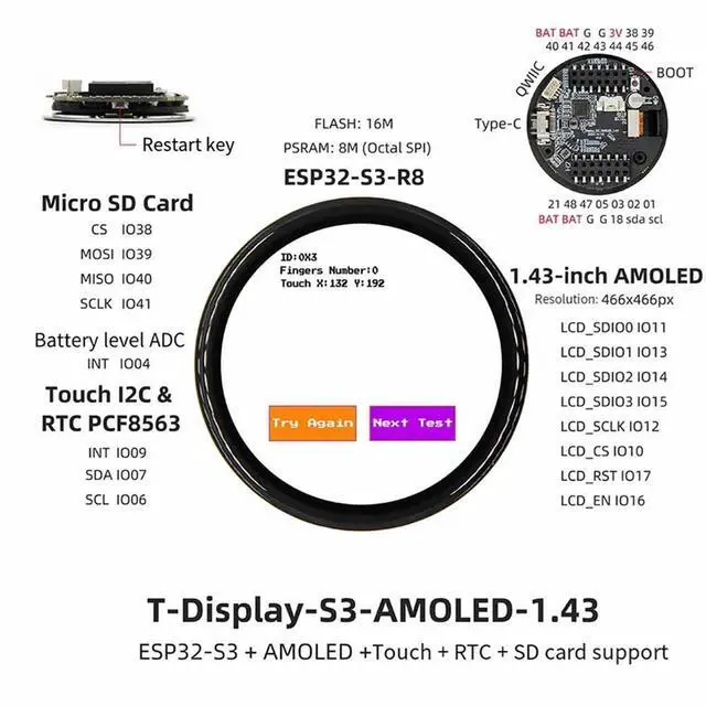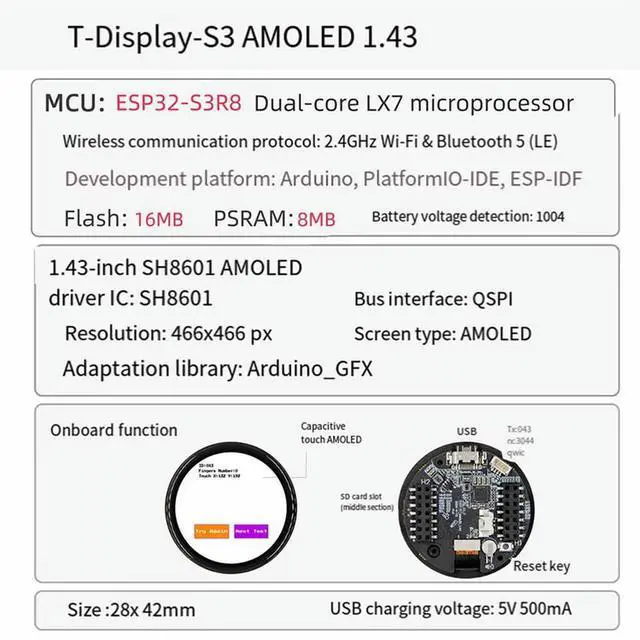 • T-Display-S3 ESP32-S3 Development Board 1.43-Inch AMOLED, , Bluetooth 16MB Flash, 8MB PSRAM