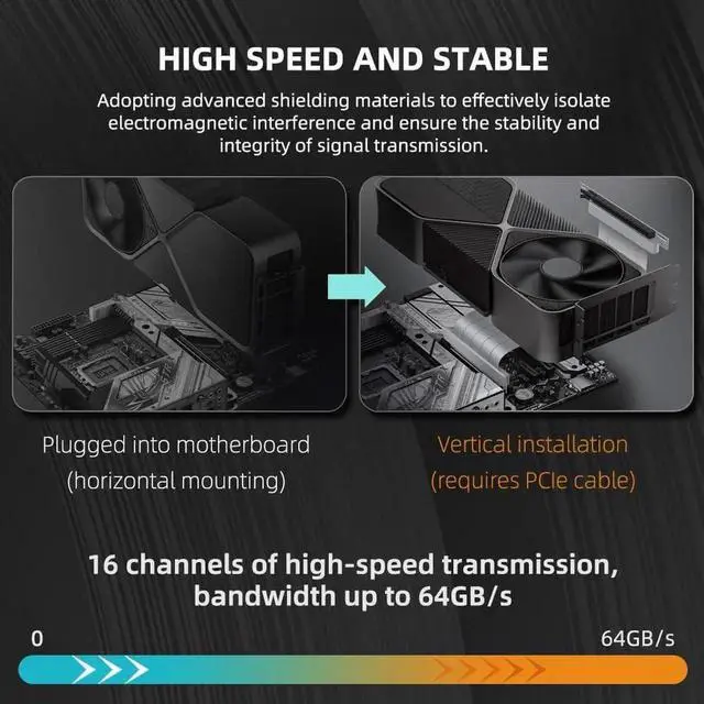 PCIE 4.0 Full Speed TransmissionAdopting the latest PCI Express 4.0 technology. The PCIE 4.0 riser cable delivers double the PCIe 3.0 bandwidth, fully supporting backward compatibility, and transfer rates of over 64Gb/s (bi-directional) with PCIe 4.0 devices at 16GT/s bit rate.