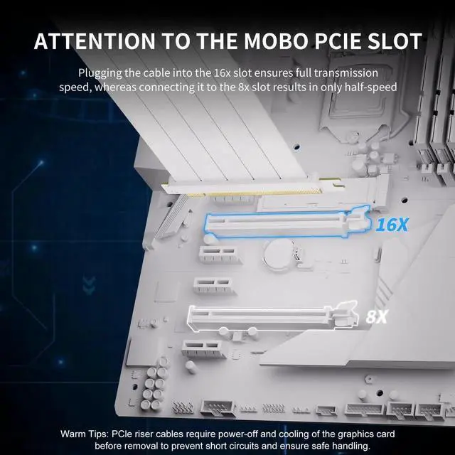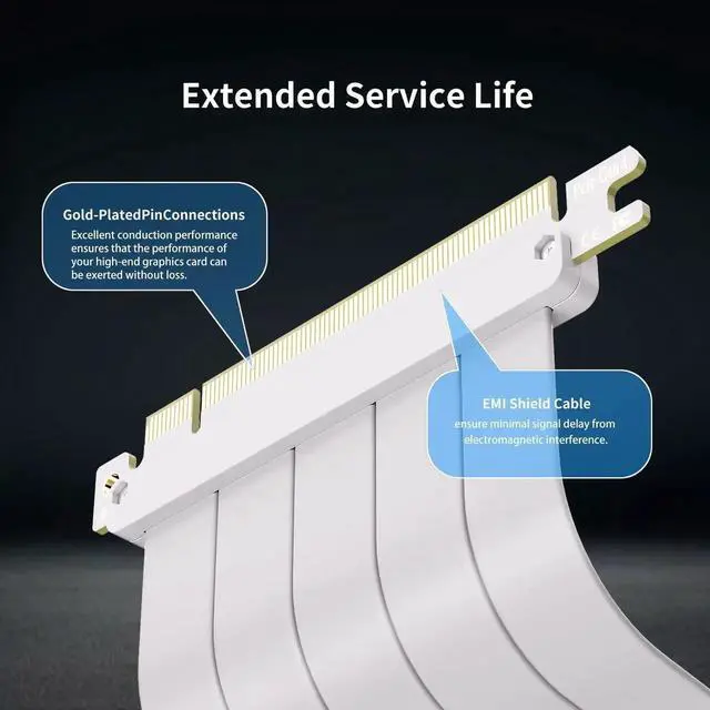 - [Gold-Plated Pins]Gold-plated PCIE pins offer maximum durability, improved signal transmission and stability, longer plug-in lifespan, reliable electrical performance, and enhanced work efficiency. Warm Tips: PCle riser cables require power-off and cooling of the graphics card before removal to prevent short circuits and ensure safe handling