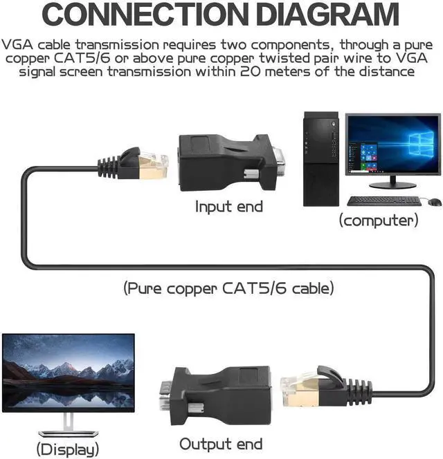 VGA to RJ45 extension signal amplifier is suitable for VGA connectors (15 pins), such as desktop computers, notebooks, projectors, monitors and other similar interface equipment signal transmission.