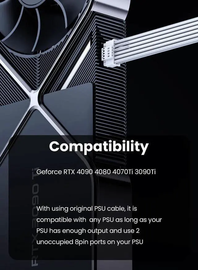 1. This cable is only suitable for RTX 4090/4080/4070ti/4070/3090ti. If you are not sure about this compatibility, please feel at ease to connect with us.