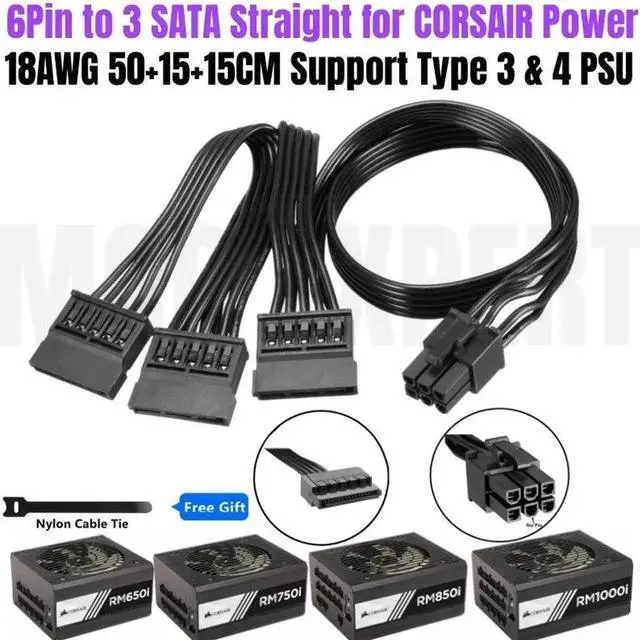 6Pin to 3 SATA Straight SSD HDD Hard Drive Power Cable for CORSAIR RM650i RM750i RM850i RM1000i Type 4 Modular PSU 50+15+15CM 18AWG