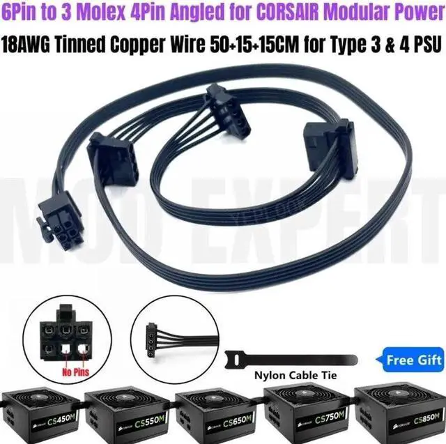 6Pin to 3 Molex 4Pin IDE/PATA Perif Floppy HDD Fan Power Cable for CORSAIR CS850M, CS750M, CS650M, CS550M, CS450M Modular PSU 18AWG 50+15+15CM