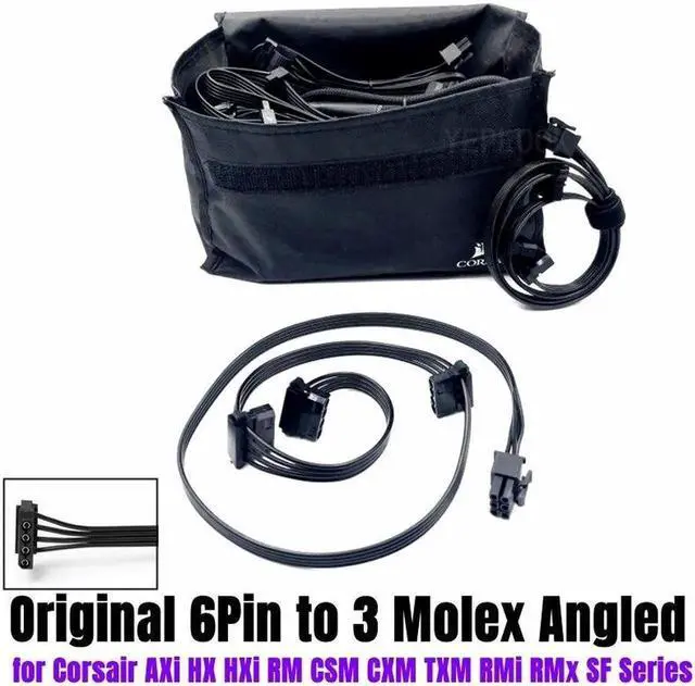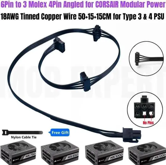 6Pin to 3 Molex 4Pin IDE PATA Perif Cooler Fan Power Cable Angled for CORSAIR HX750 HX850 HX1000 HX1200 TYPE 4 Modular PSU 18AWG 50+15+15CM