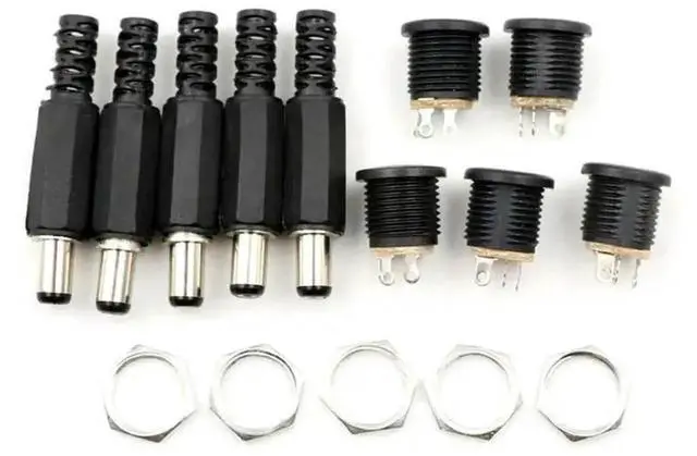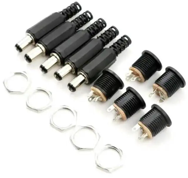10Pcs (5Pair) 12V 3A 5.5 x 2.1 mm DC Power Male Plugs Connector DC Power Socket Female Jack Screw Nut Panel Mount Adapter 5.5 * 2.1 mm