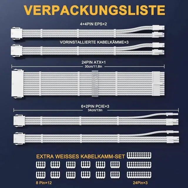 - [High-Quality Product and Service]The extension kit includes 1x 24pin motherboard cable, 2x 8pin CPU cables, and 2x 8pin high-performance graphics card power cables, each 30cm/11.8inch long. is committed to providing top-quality, customized extension cables and PC accessories. With our quality assurance, we offer free replacements within a year for any quality issues.