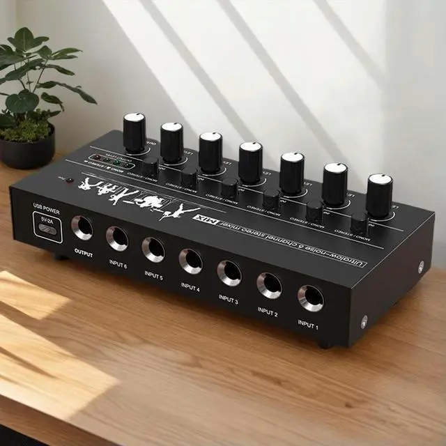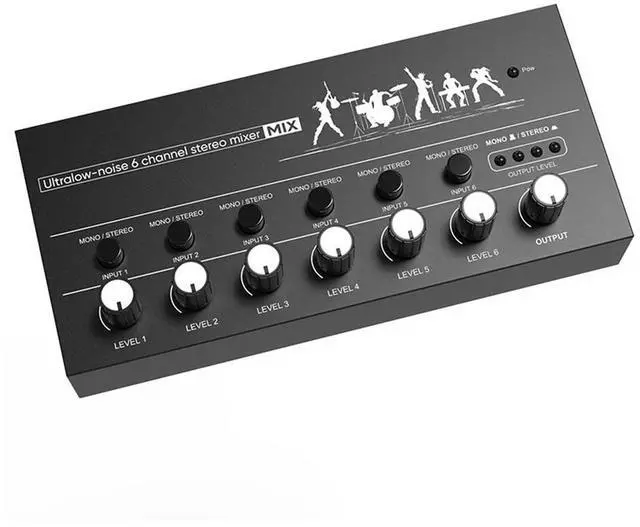 • 6-Channel Mini Audio Mixer Ultra Low Noise Sound Mixer Easy Operation Stereo Mixer for Guitars Bass Keyboards Mixer