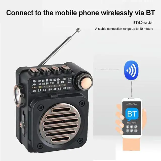 • Portable Radio Wireless BT Music Player FM AM SW Stereo Radio with LED Flashlight for Indoor Outdoor