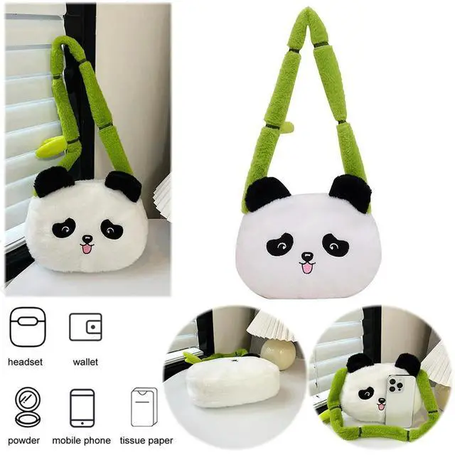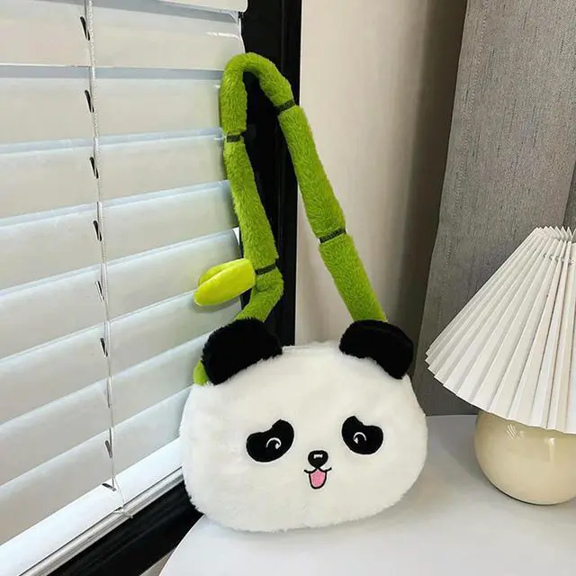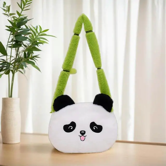 • Women Shoulder Bag Panda Shaped Plush Crossbody Bag Bamboo Shaped Strap Clutch Purse for Travel Shopping