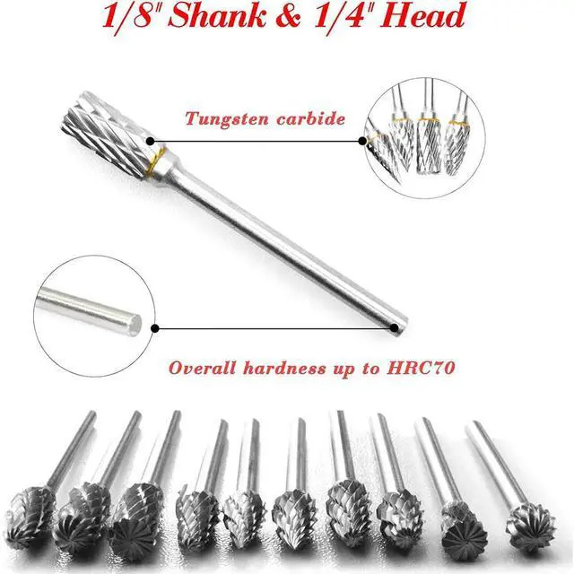 10Pcs Rotary File Rasp 1/8 Inch Shank Solid Tungsten Carbide Rotary Burr Set for l Welds Carving Cutting Engraving Porting