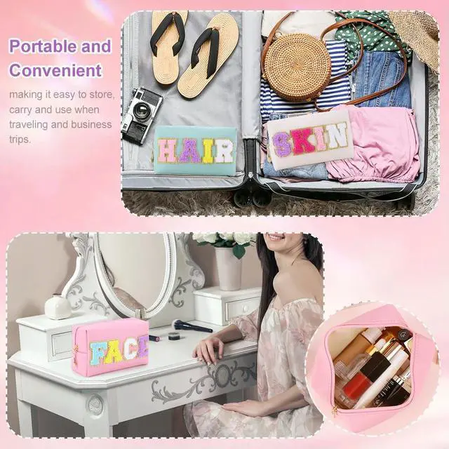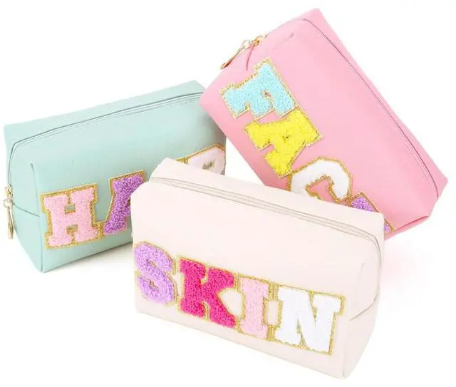 • 3PCS Makeup Organizer Bag Set with Patches Chenille Letter Cosmetic Pouch Zipper Closure PU Leather for Travel Accessories