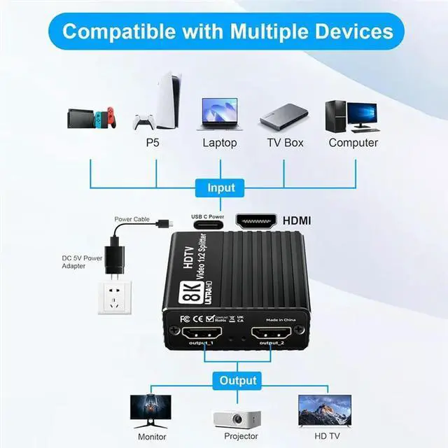 • Ultra HD 8K HDTV 1:2 Splitter 2.1 8K 60Hz/4K 120Hz/1080P 240Hz For PS5 PC Laptop Computer EDID Enabled Conputer