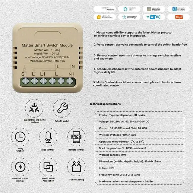 Tuya Matter Switch Module Mini Relay Timer Voice Control App Remote Control Work With Alexa Google Home
