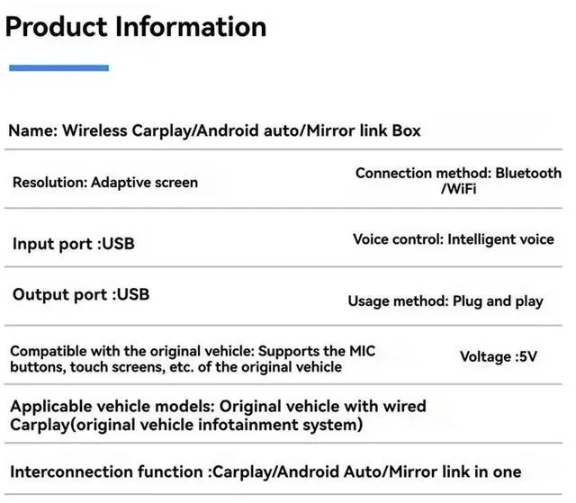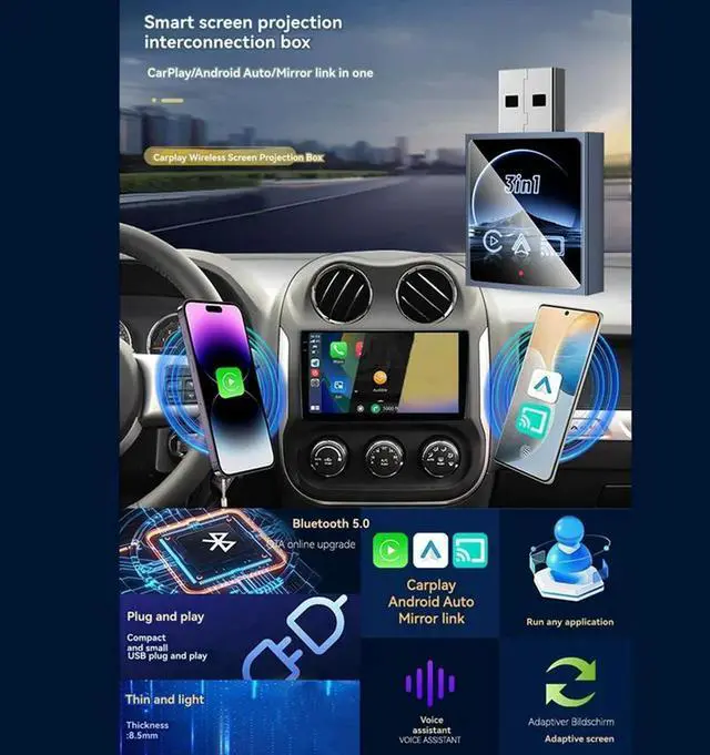 • Carplay Wireless Adapter Android Auto Mirror Link 3 In 1 USB Dongle Wired To Wireless Plug And Play