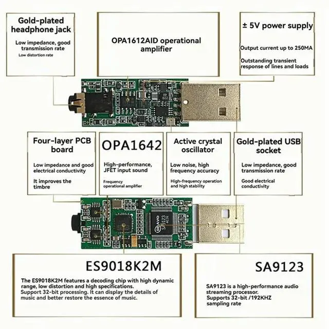 • DAC Decoding Portable DAC USB External Sound Card Ear Decoder Headphone Amplifier ES9018K2M OPA1612AID Op Amp