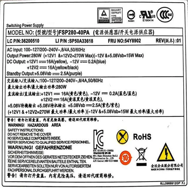 • PSU M4500 M4550 M5800 M6300 M6400 M6408 M6475 M8400T TS140 TS230 14Pin 280W Power Supply FSP280-40PA 54Y8902