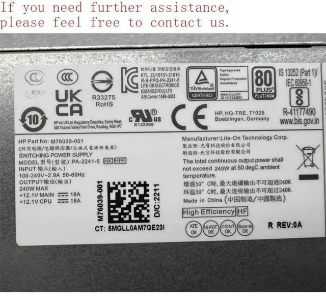 • For Pro 400 G9R SFF M76039-001 PA-2241-5 240W Small Chassis Power Supply