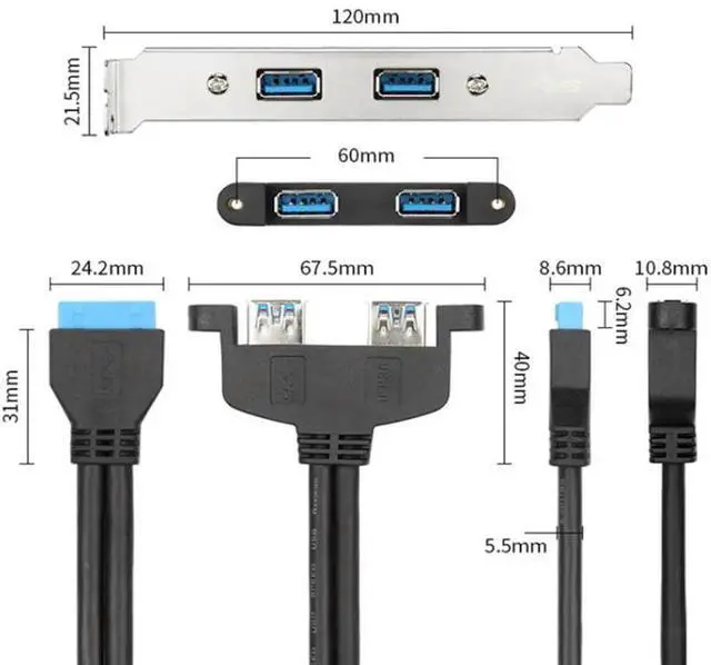 • 50cm 5Gbps 2 Ports USB 3.0 Female Back Panel To Motherboard 20pin Header Connector Cable Adapter With PCI Slot Plate Bracket