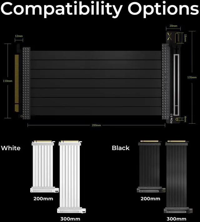 Riser cable features gold-plated connectors for lower resistance, superior signal integrity, and long-term stable performance.