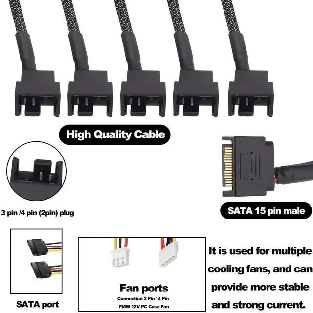 1. SATA Male to 5pcs 3 /4 pin PC case fan cooling power cable is used to extend and expand 3Pin/4pin interface for the motherboard,help to save space for PC case and support power multiple computer fans from one SATA connection.