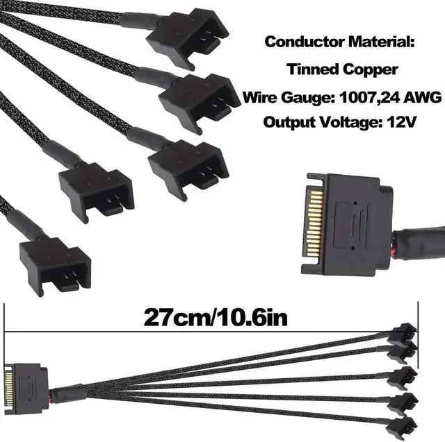Plug: 1 SATA male to 5 x 3pin /4 pin male PC fan connector Cable Length: 27CM /10.6 inch