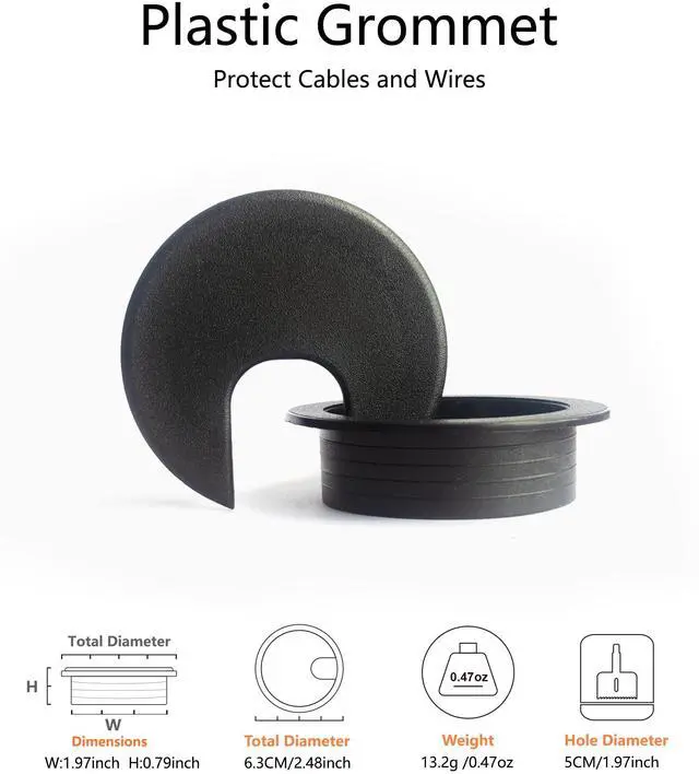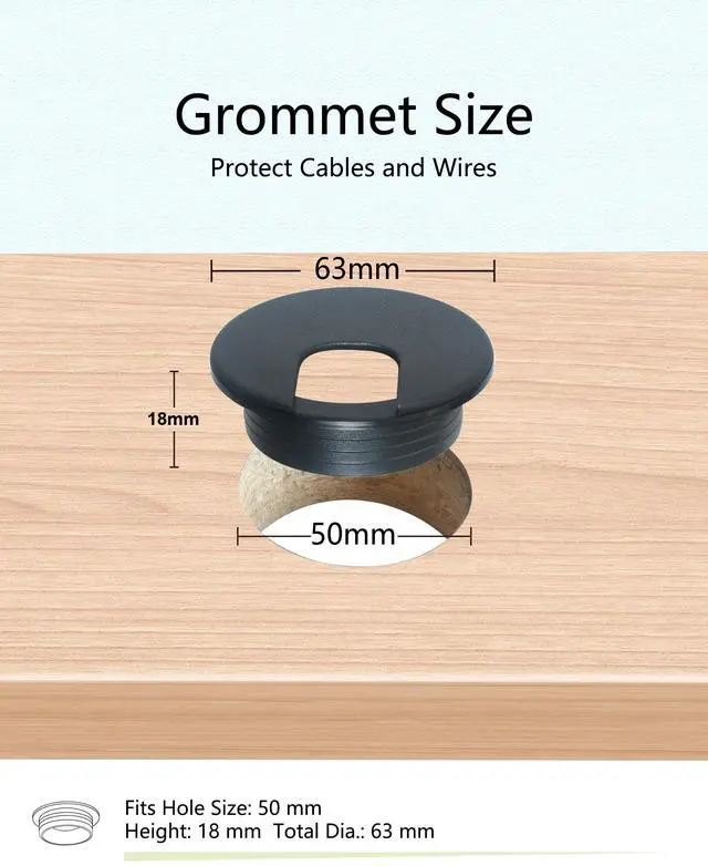 Includes: This set contains 1 pc 50 mm hole saw blade with drill bit, 23 mm depth; 6 pcs 50 mm plastic desk wire cord cable grommets; 1 pc hex key; 1 pc 2m diameter 16 mm cable sleeve. Its time to clean up wire clutter on your desk trading station.