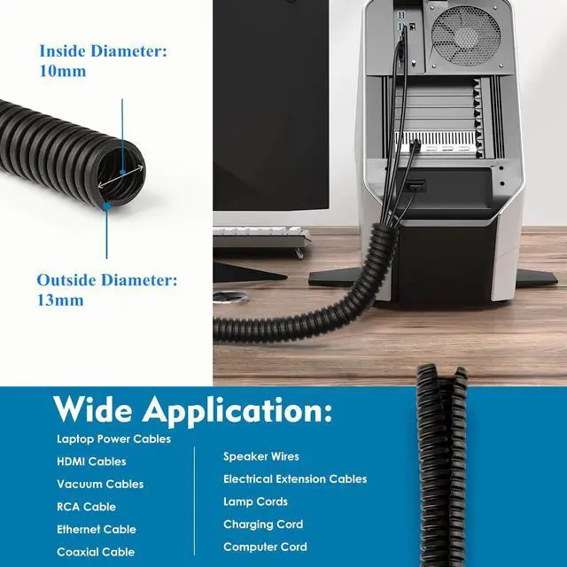 10 ft: With 10 feet of split loom tubing, measuring 7.17 x 7.05 x 1.89 inches, you'll have plenty of material to cover cables and wires at home, in your garden, or office. This tubing can be cut to any size for use with computer leads, television cables, and other electronic devices.