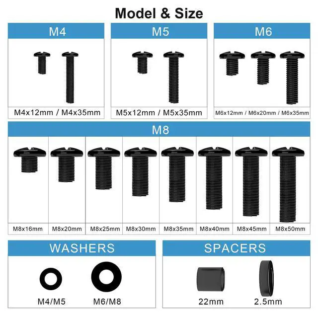 • DESIGN - This product is a complete set of screws with washers and spacers, including M4, M5, M6, and M8 TV screws and spacers for TVs up to 80".