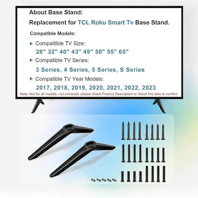 ---Universal Compatibility--- Replacement for TCL Roku TV stand base, suitable for various sizes including 28 inch, 32 inch, 40 inch, 43 inch, 49 inch, 50 inch, 55 inch, and 65 inch models. Ensure to double-check the specific model compatibility.