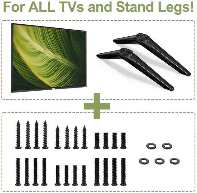 --All in One Pack-- This TV stand screws hardware kit includes all necessary parts to assemble your TV to a stand. The kit comes with various screws and washers for TV stand base legs.